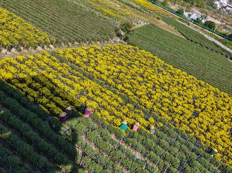 初冬時節(jié),菊香滿溢。走進休寧縣海陽鎮(zhèn)鹽鋪村菊花產(chǎn)業(yè)基地,小黃菊、小白菊、金絲皇菊競相綻放,白潔黃艷的花朵綴滿枝頭,連片成海、蔚為壯觀。菊農(nóng)們搶抓晴好天氣,四五成群穿梭花叢間,指尖翻飛采摘鮮菊,將一簇簇燦爛繁花收入籃中,臉上滿是豐收的喜悅。作為有著20余年菊花種植歷史的產(chǎn)業(yè)領(lǐng)頭村,鹽鋪村如今菊花種植面積達1600多畝,今年氣候宜人讓菊花長勢格外旺盛,畝產(chǎn)值高達1.3萬元,這朵“致富花”讓村民的腰包越鼓越實。
